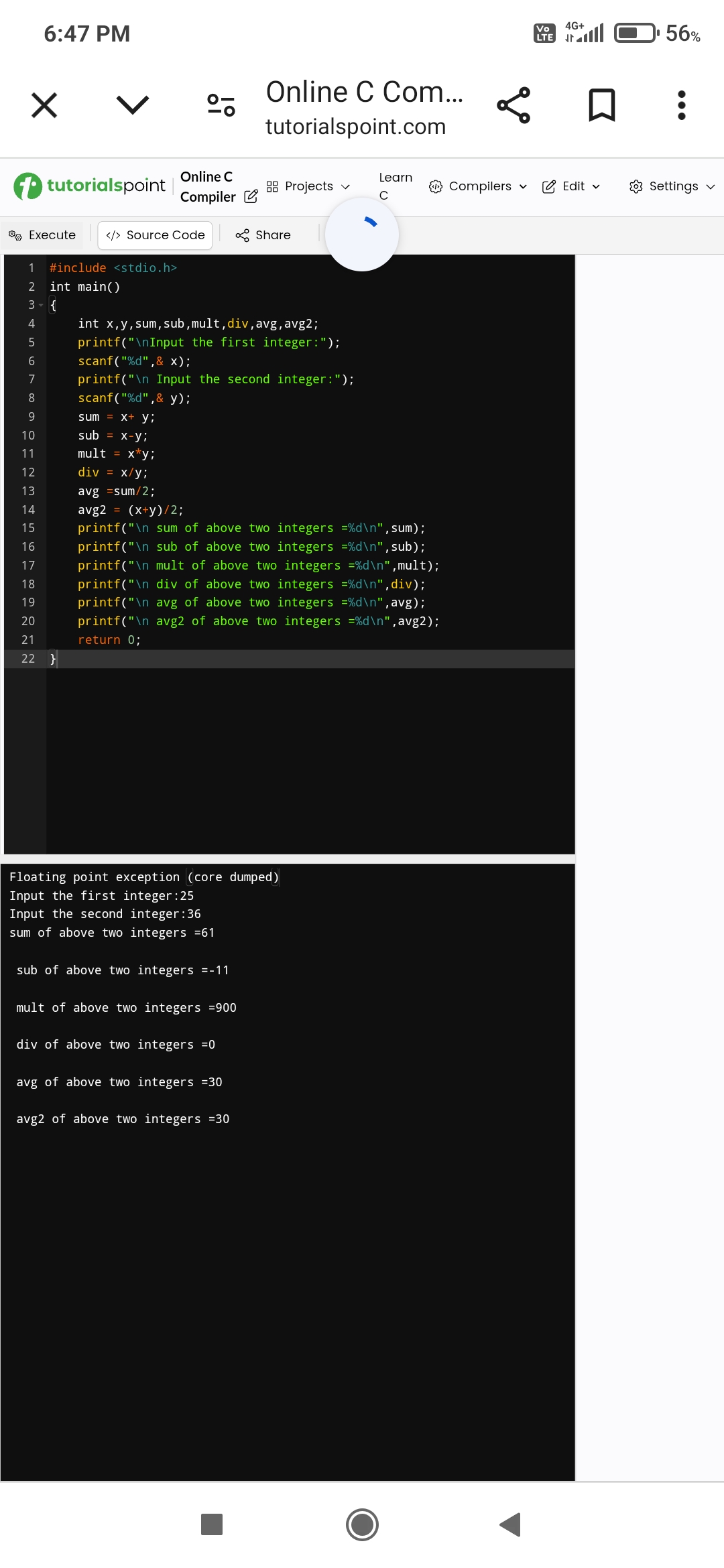 Write a C program to find sum,sub, mult,div,avg of two integer