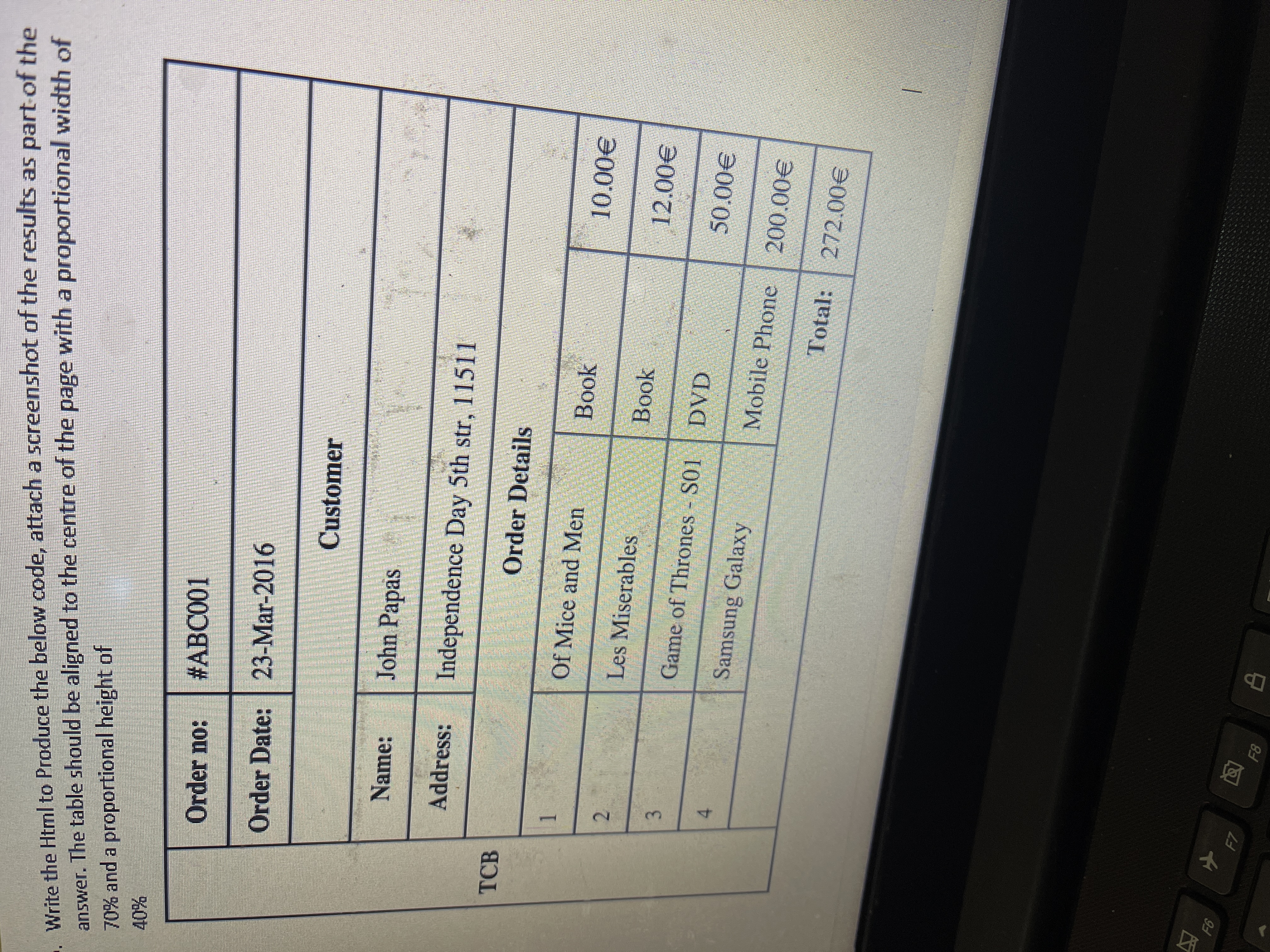 Write the Html to Produce the below code, attach a screenshot of the results as part of the answer. The table should be aligned to the centre of the page with a proportional width of 70% and a proportional height of 40%